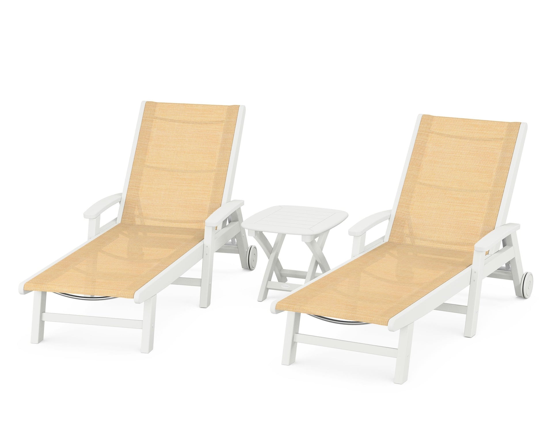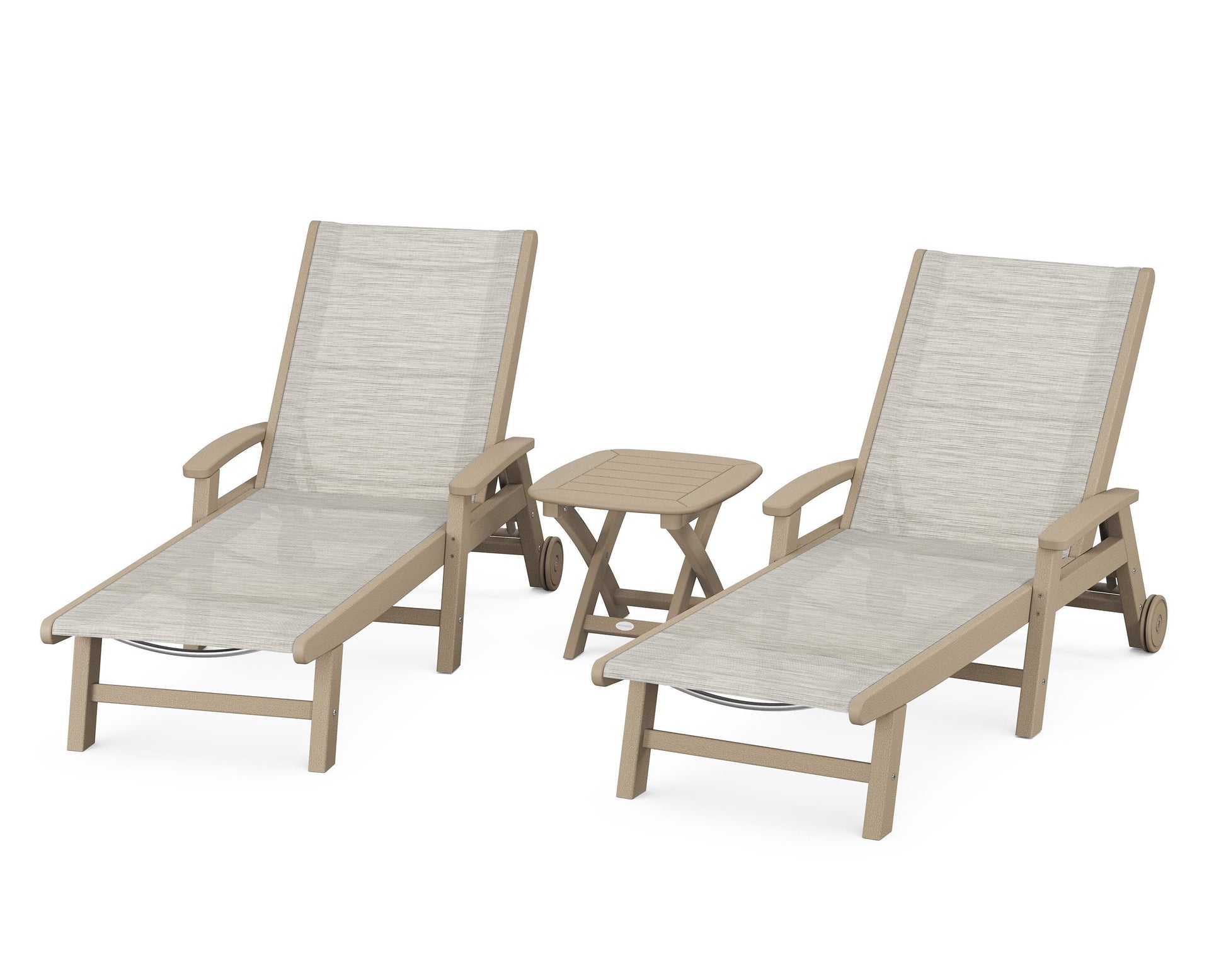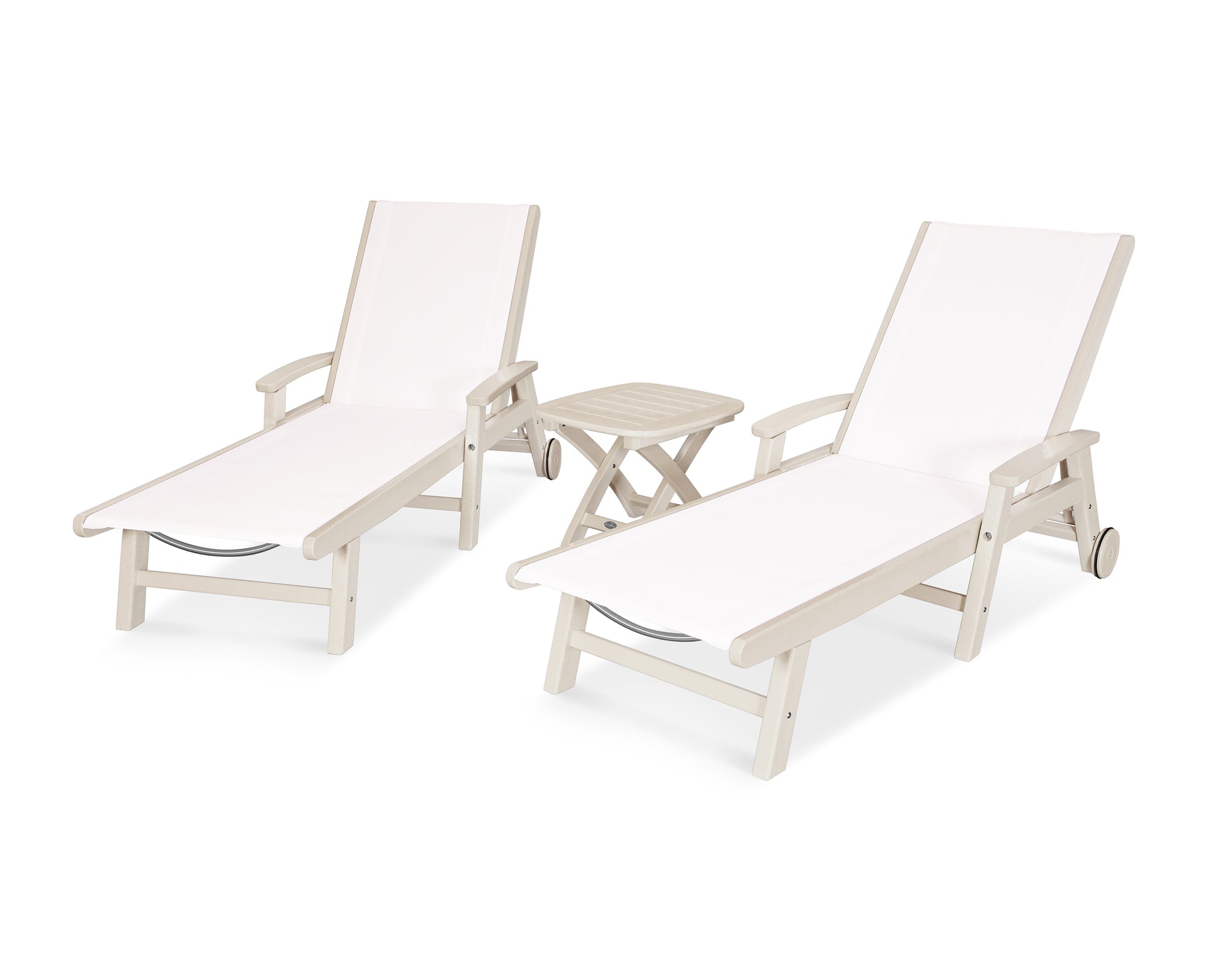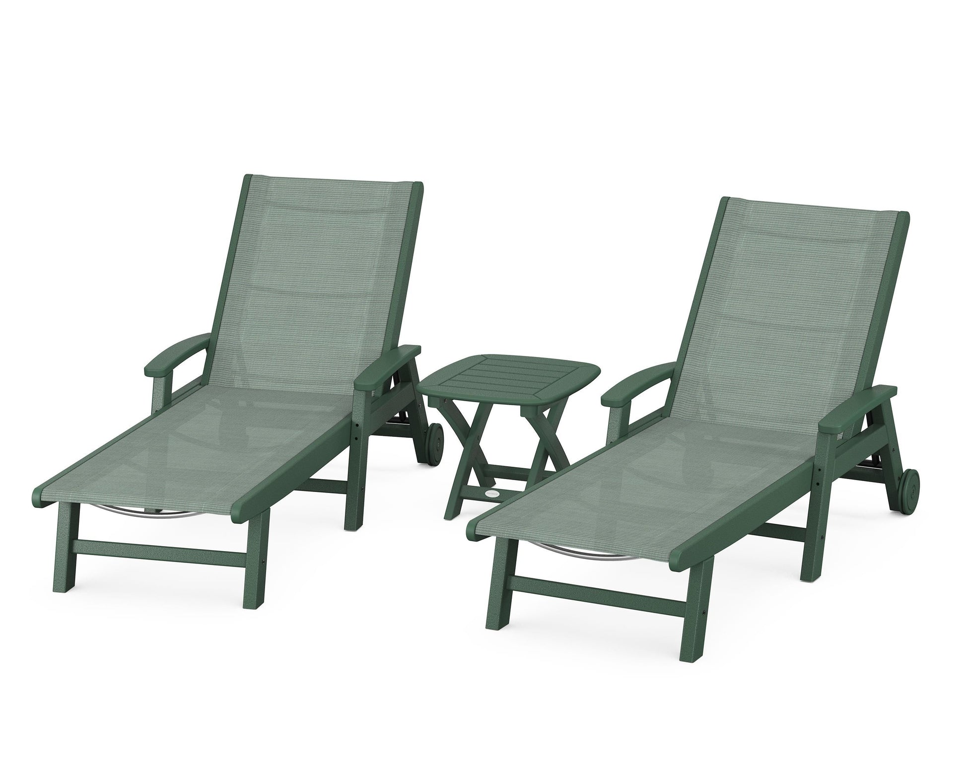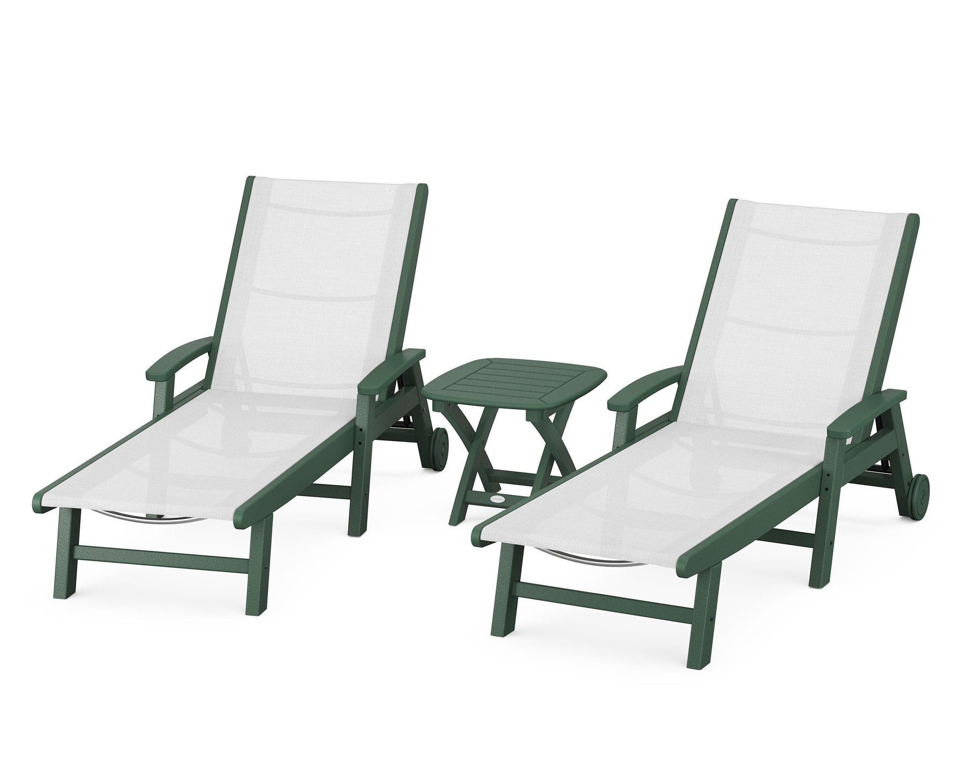 Lie back and relax in the Coastal 3-Piece Chaise with Wheels Set, fitted with a breathable fabric sling for optimal comfort. Conveniently equipped with wheels, you can easily move your all-weather chaise lounges to wherever the sun takes you, and the coordinating side table is the perfect place to set your drinks. Whether poolside or on your patio or deck, this set will look great for many years to come.