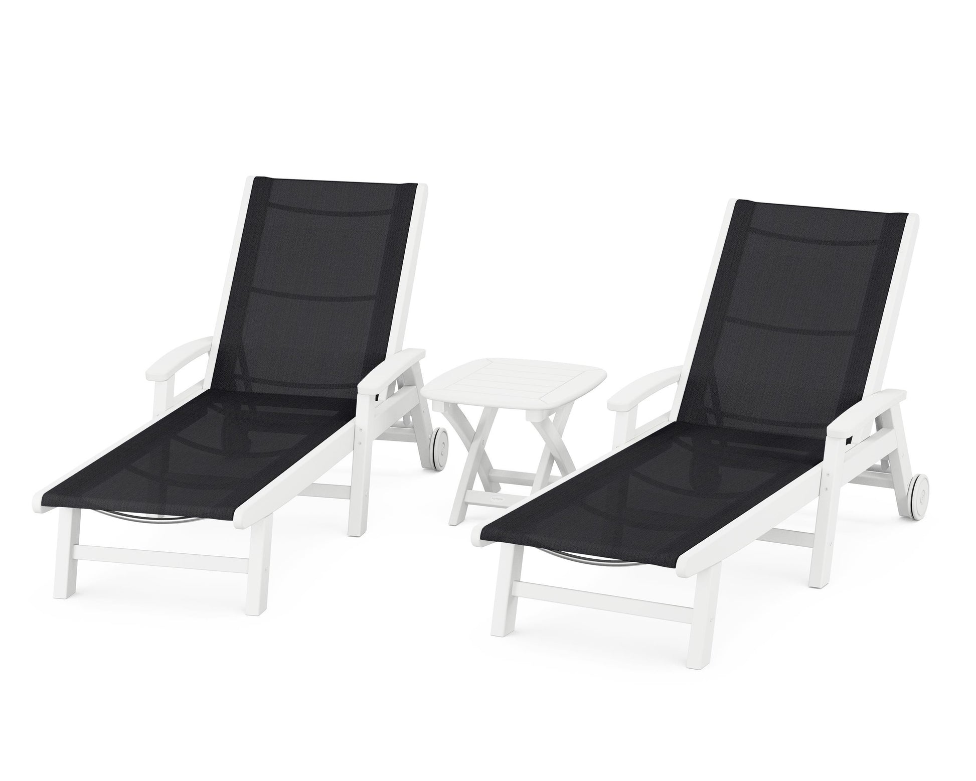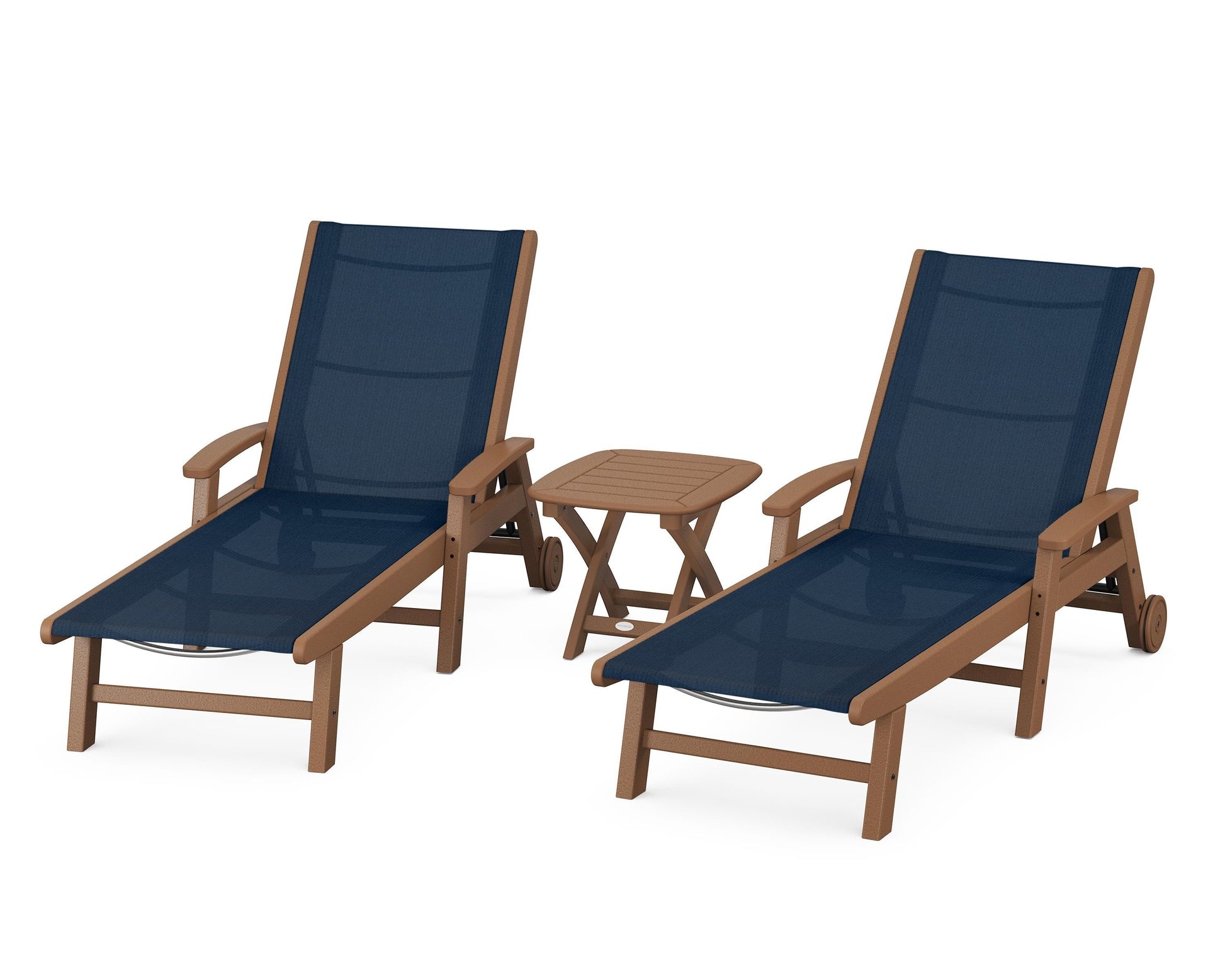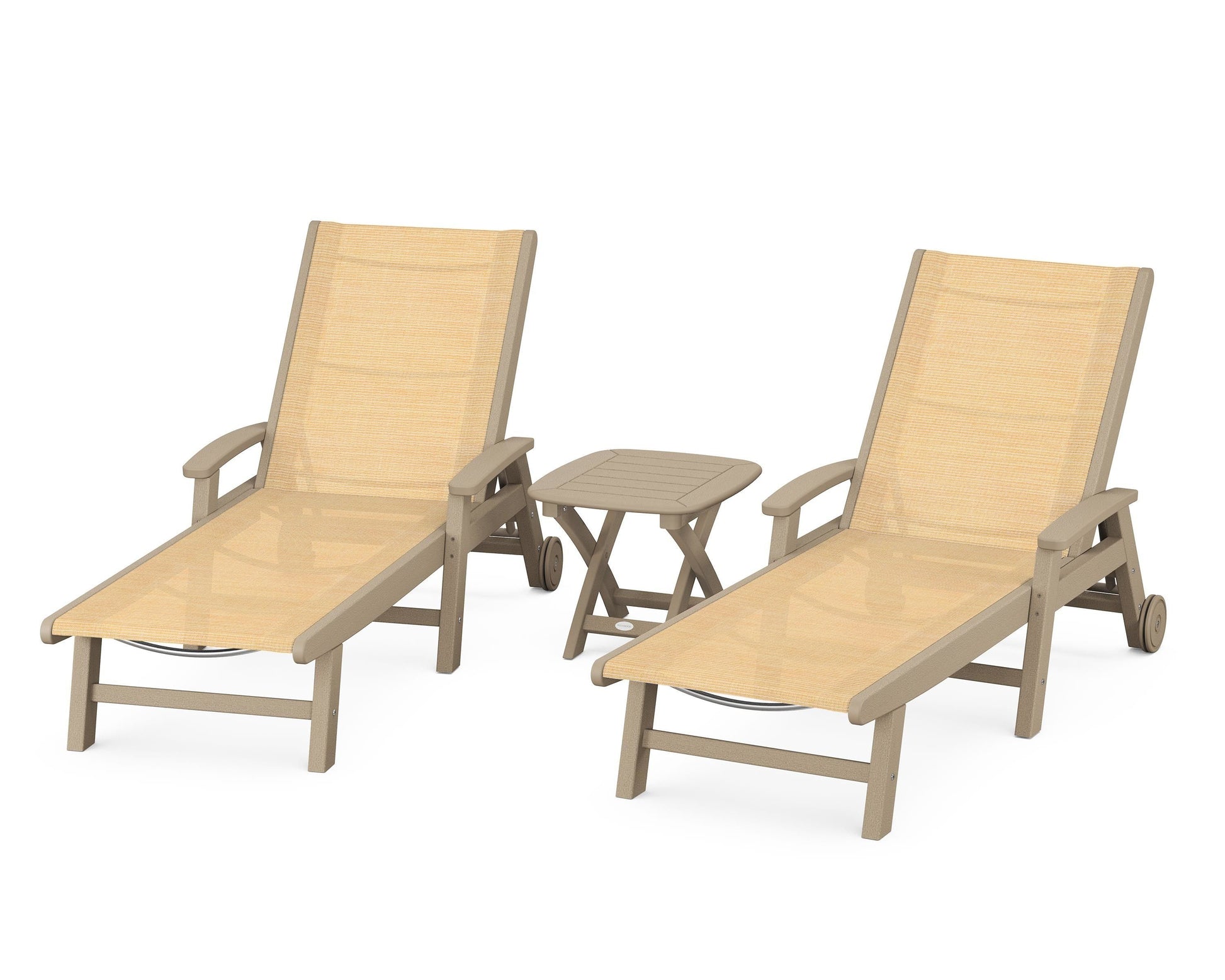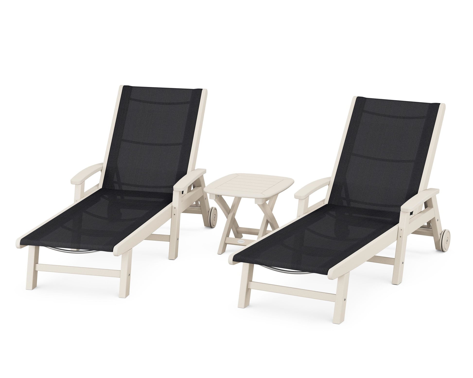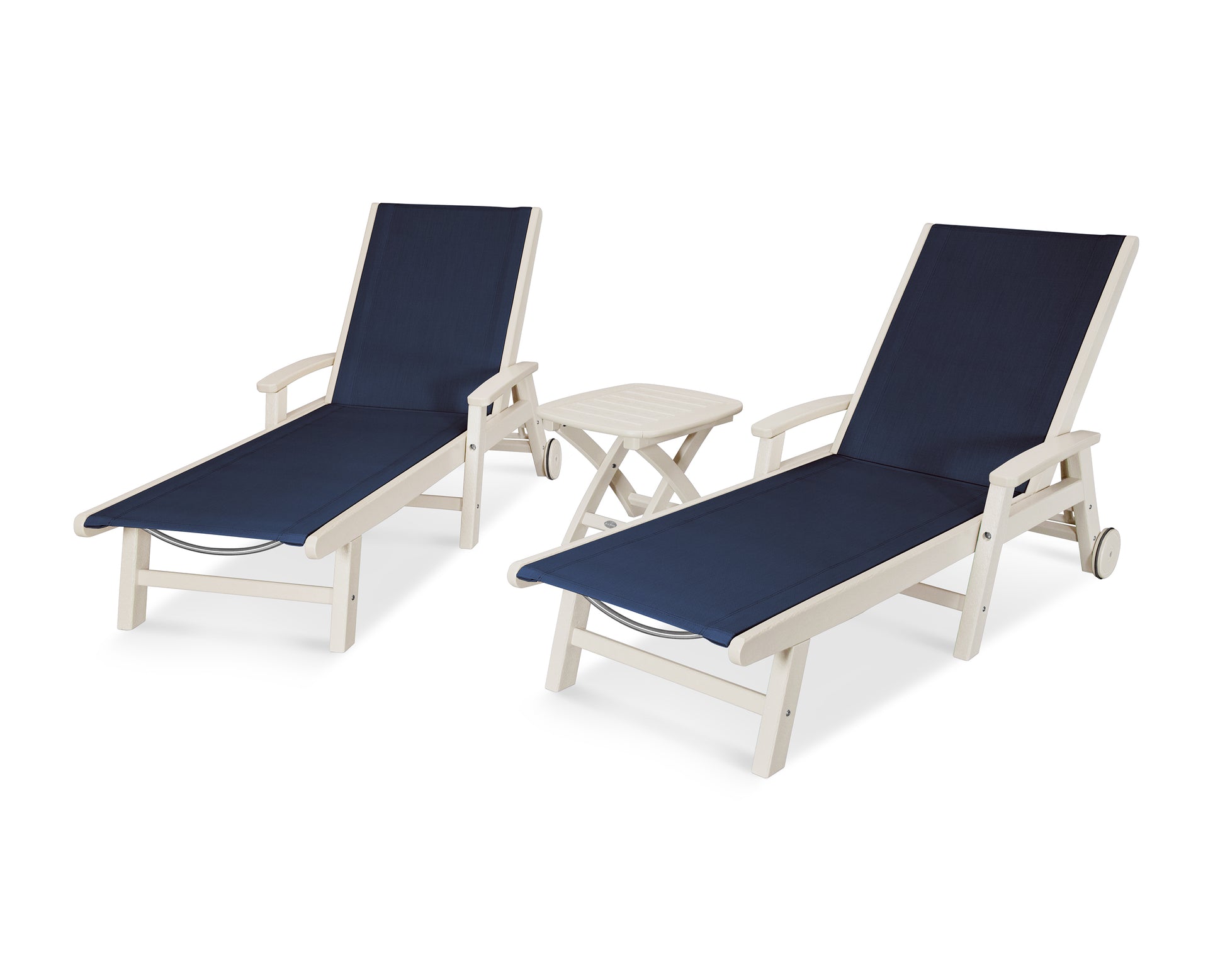 Lie back and relax in the Coastal 3-Piece Chaise with Wheels Set, fitted with a breathable fabric sling for optimal comfort. Conveniently equipped with wheels, you can easily move your all-weather chaise lounges to wherever the sun takes you, and the coordinating side table is the perfect place to set your drinks. Whether poolside or on your patio or deck, this set will look great for many years to come.