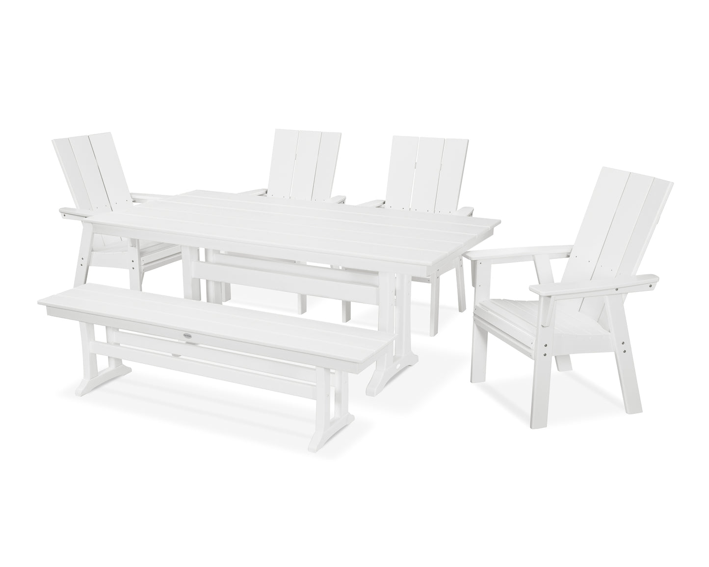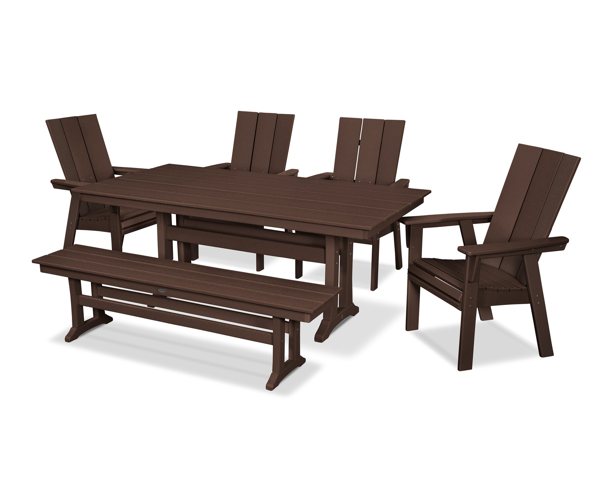 The Modern Curveback Adirondack 6-Piece Farmhouse Dining Set with Trestle Legs and Bench offers extra-comfortable seating around a farmhouse-style table. Set out a charcuterie board, invite your best friends over, and savor more moments together?this all-weather set serves as the perfect backdrop for casual outdoor entertaining.