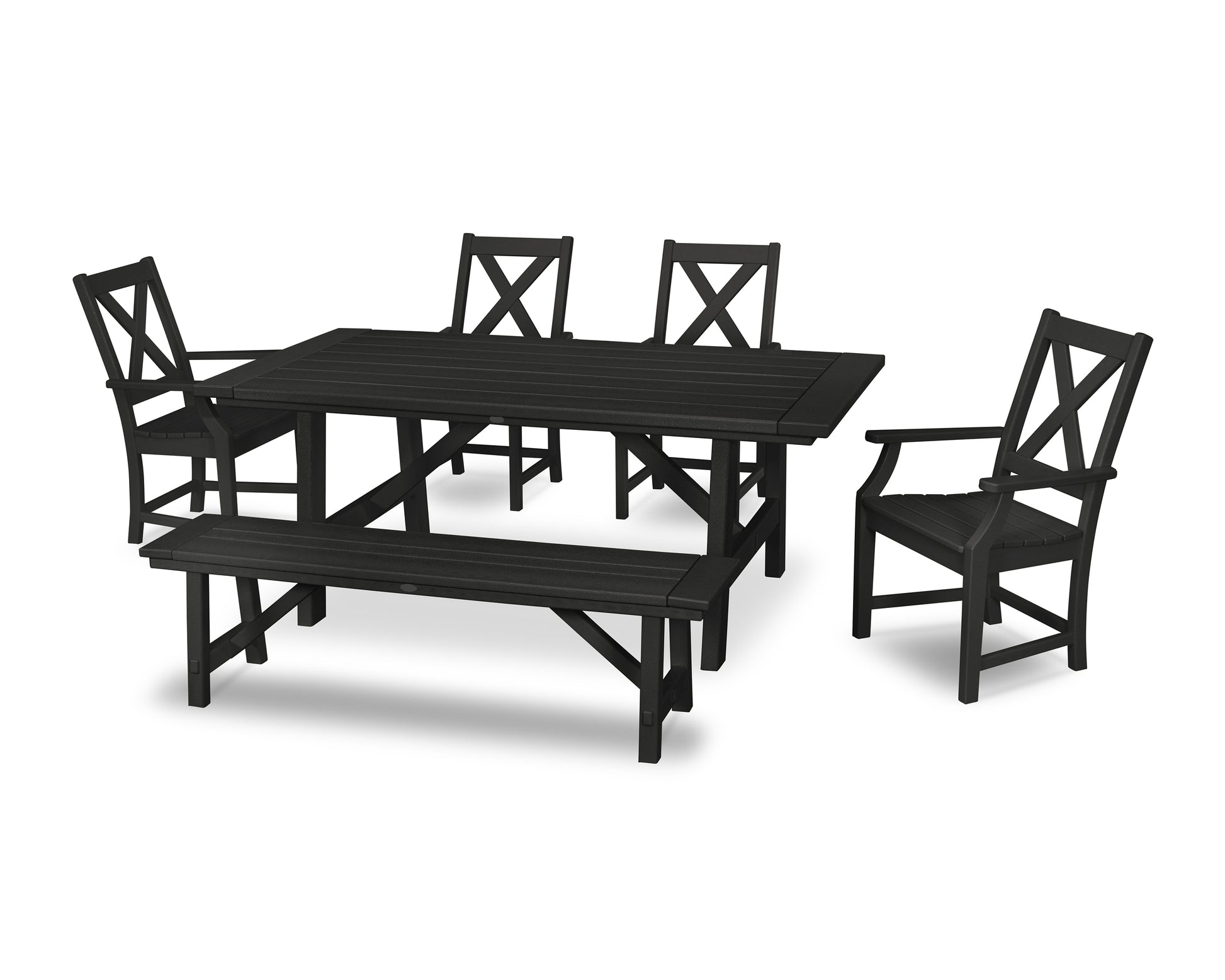 The POLYWOOD Braxton 6-Piece Rustic Farmhouse Arm Chair Dining Set with Bench has an attractive, rustic style that will add charm to any outdoor space. Your guests will enjoy comfortable seating with the Braxton Dining Arm Chairs and the Rustic Farmhouse 60" Backless Bench, and no matter where everyone sits they will have plenty of legroom thanks to the large Rustic Farmhouse 39" x 75" Dining Table. Make every backyard gathering extra special with POLYWOOD furniture.