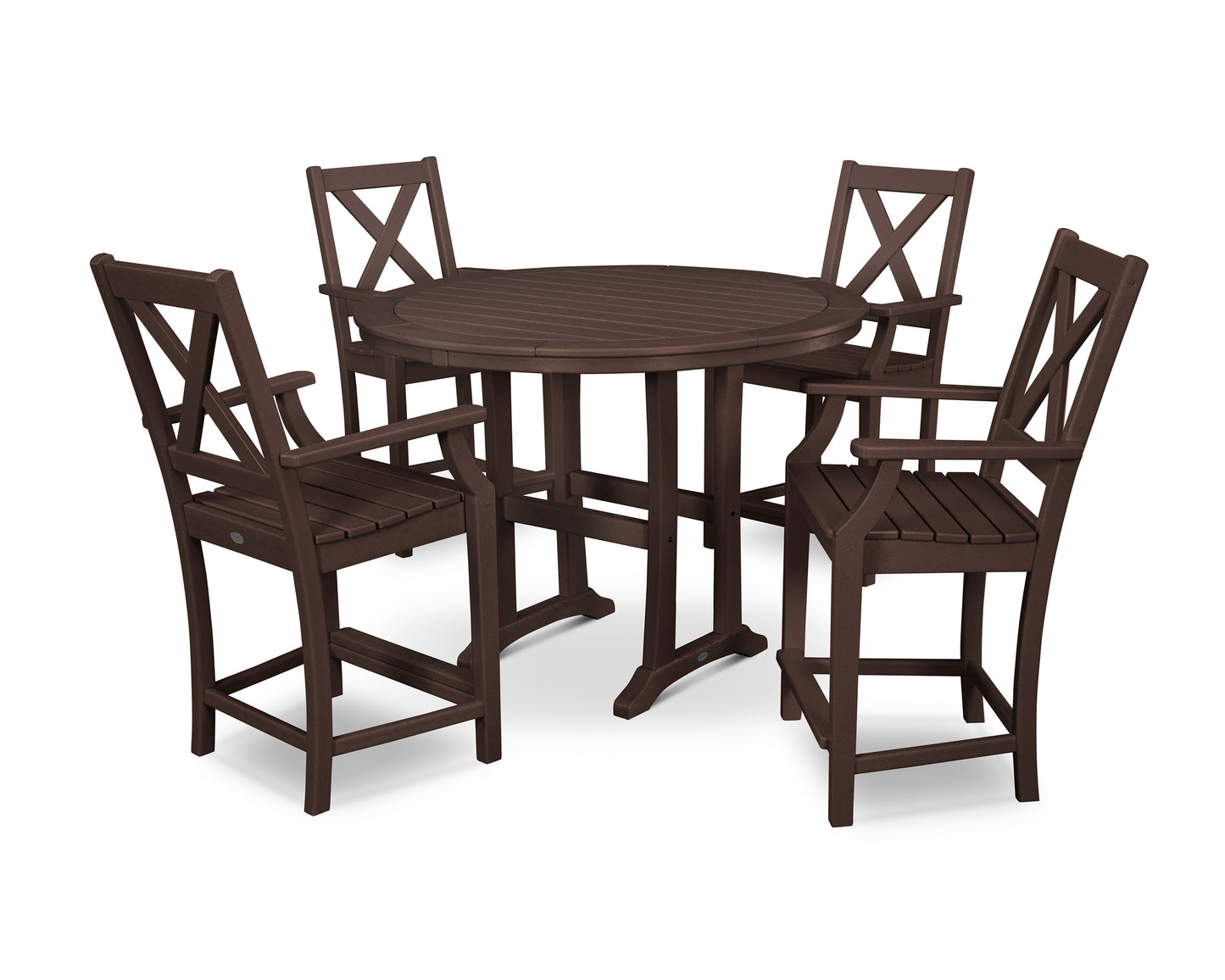 The POLYWOOD Braxton 5-Piece Nautical Trestle Arm Chair Counter Set is the perfect addition to any outdoor space. Its versitile design allows the set to fit into a modern poolside locale or a quaint terrace setting. The Braxton Counter Arm Chairs will bring added relaxation to your already calm outdoor environment, and the Nautical Trestle 48" Round Counter Table will give you plenty of table space to enjoy a cool glass of lemonade with the ones you love.