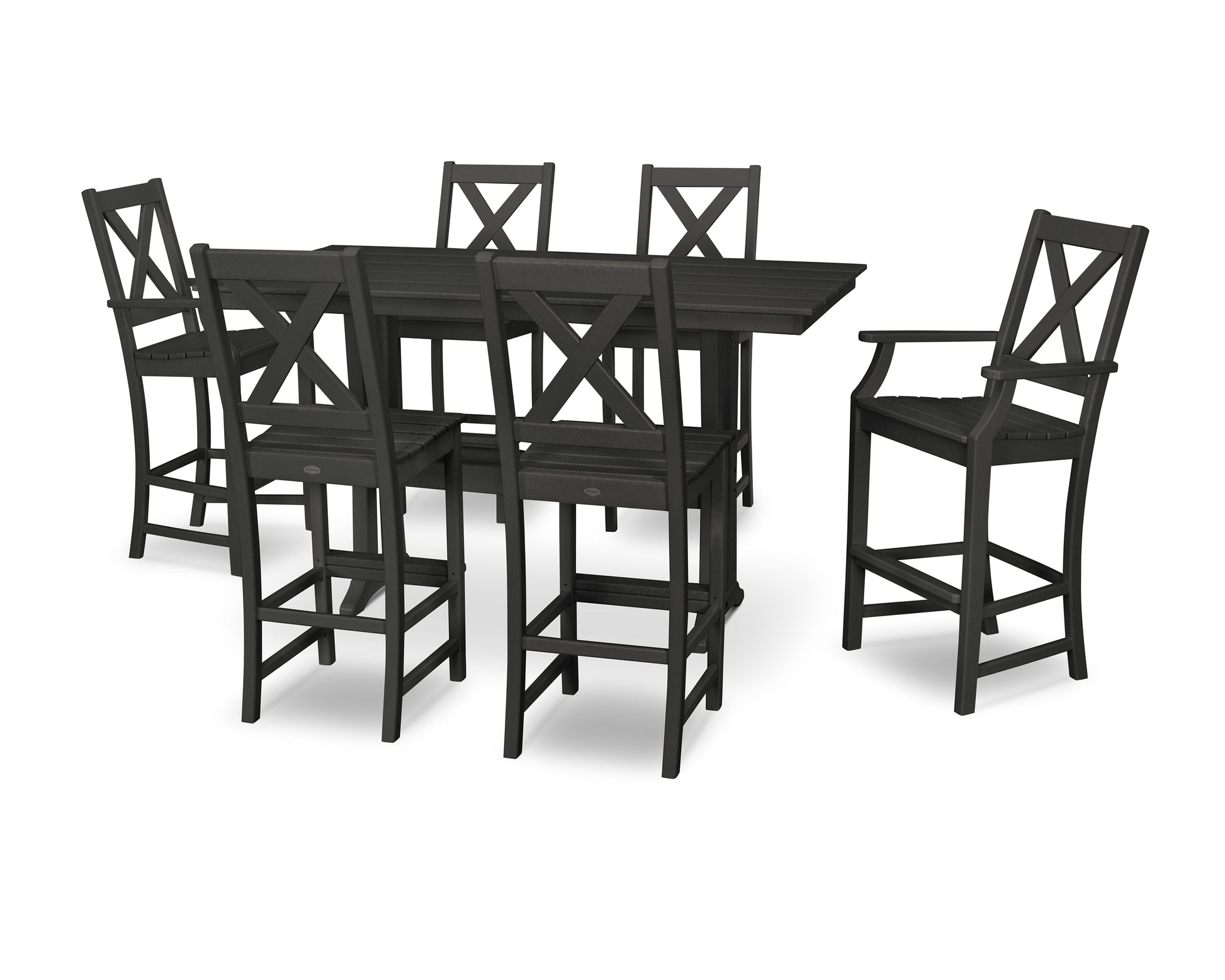 Welcome five of your closest family and friends to join you on your back patio to visit and relax on the POLYWOOD Braxton 7-Piece Farmhouse Trestle Bar Set. This set is durable, comfortable, and quite attractive in any outdoor space. There is no shortage of tablespace on the Farmhouse Trestle 37" Bar Table, and the relaxing bar chairs from the Braxton Collection will only add to the ambiance so you and your loved ones can really enjoy your time together.