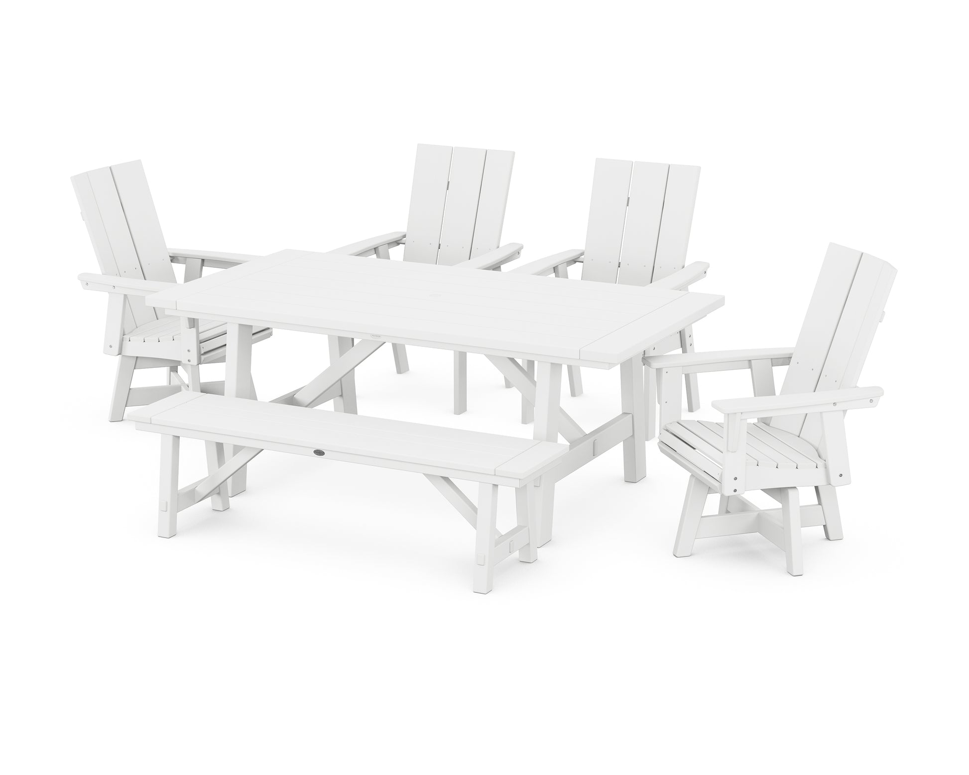 The Modern Curveback Adirondack Swivel Chair 6-Piece Rustic Farmhouse Dining Set with Bench offers comfortable seating around a spacious, spill-proof table. Set out a charcuterie board, invite your best friends over, and savor more moments together?this all-weather set serves as the perfect backdrop for casual outdoor entertaining.