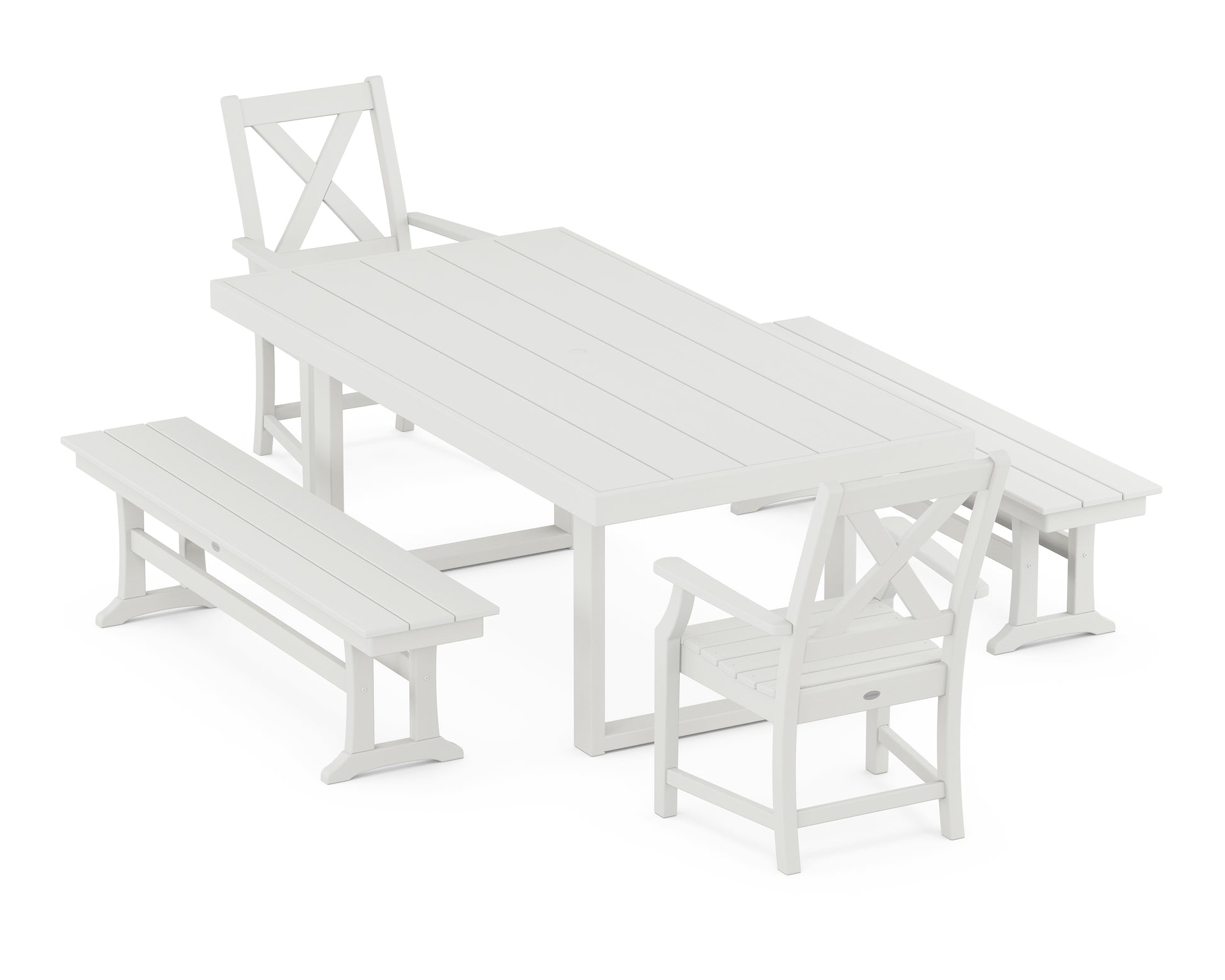 A blend of modern design and rustic elements, the Braxton Collection is always a conversation starter. Forever in season and forever in style, this all-weather collection finds its balance with clean lines, curved profiles, and farmhouse-inspired X-back design. Set an inviting dinner scene for family and friends with our Braxton 5-Piece Dining Set with Benches, an inviting arrangement of mixed seating around a spacious table.