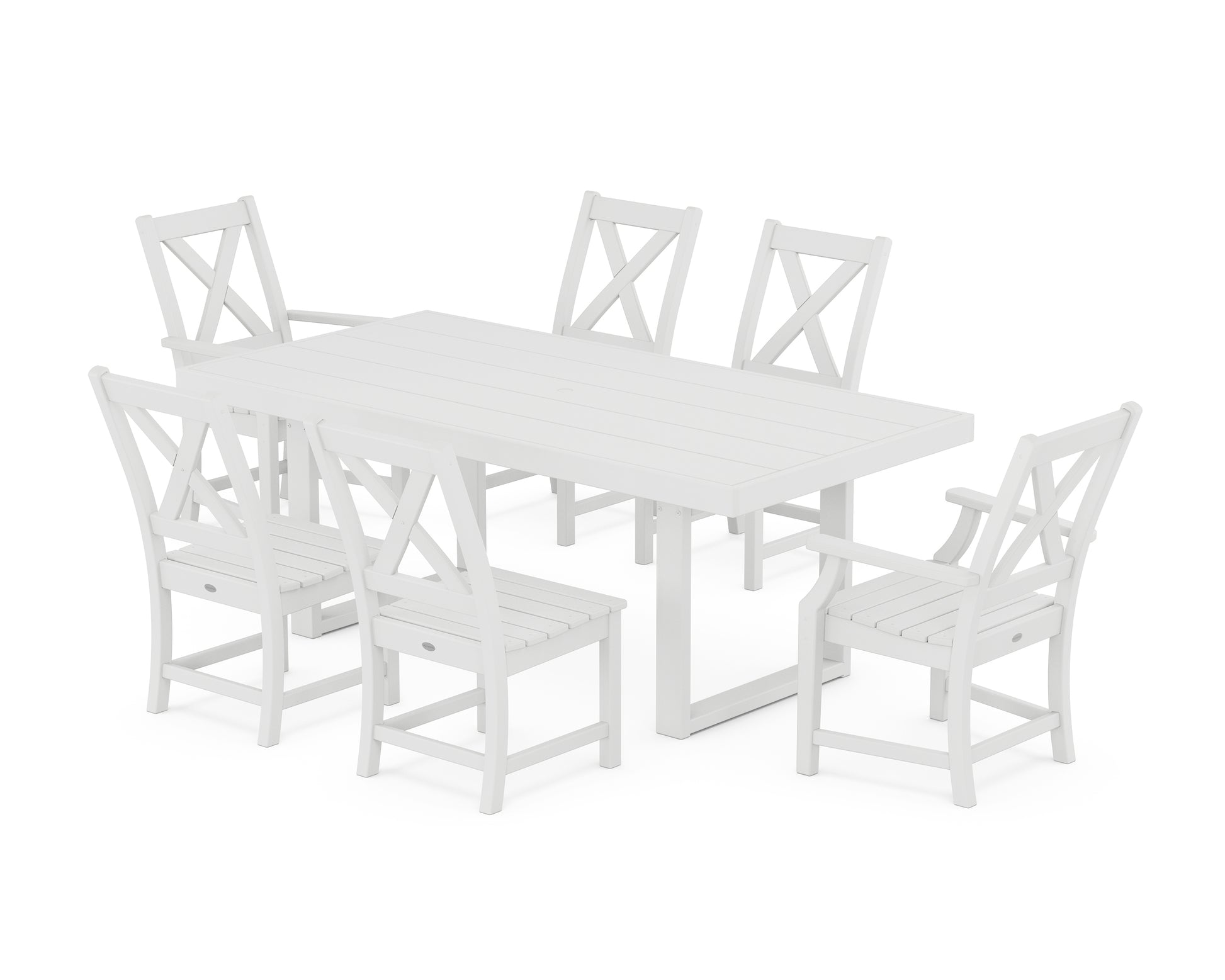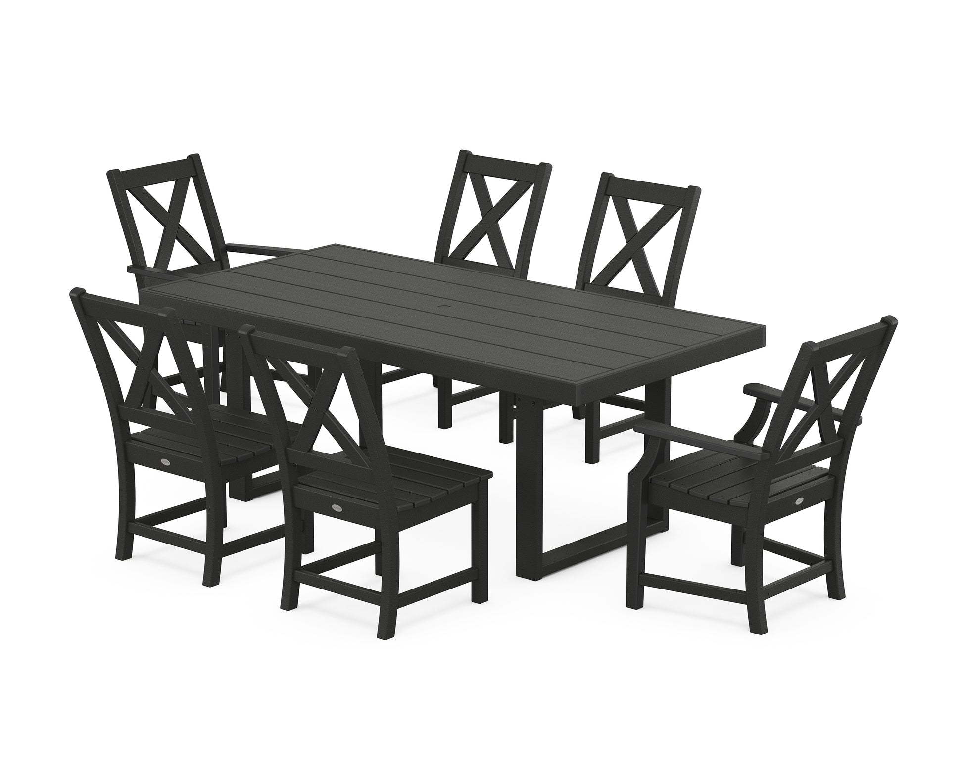 A blend of modern design and rustic elements, the Braxton Collection is always a conversation starter. Forever in season and forever in style, this all-weather collection finds its balance with clean lines, curved profiles, and farmhouse-inspired x-back design. Set an inviting dinner scene for family and friends with our Braxton 7-Piece Dining Set, shown here with four side chairs and two armchairs sitting pretty around a rectangle dining table.