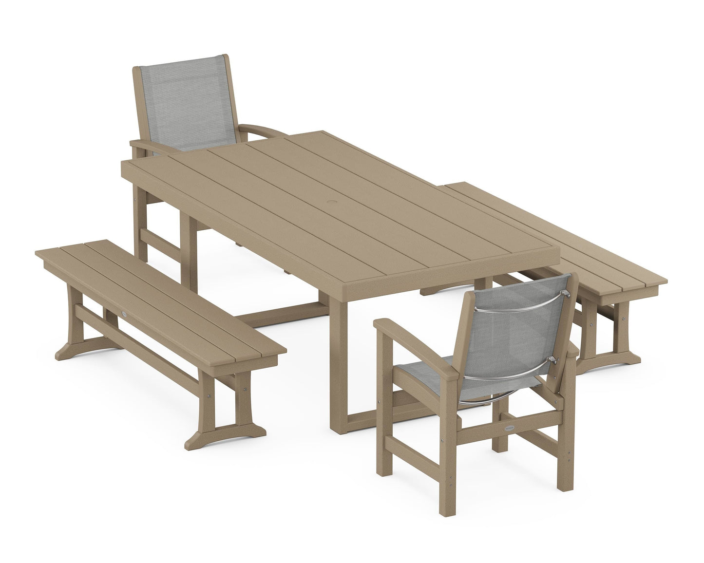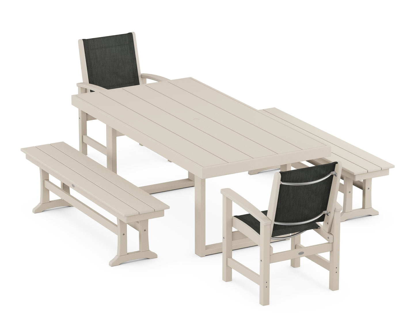 Two words can sum up the Coastal Collection: comfortable and carefree. Designed with materials that withstand all the elements, these dining chairs feature genuine POLYWOOD lumber frames and all-weather sling seats with the perfect amount of bounce. While the versatile seats work with any and all style preferences, we love the look of the Coastal 5-Piece Dining Set, which pairs two armchairs and two benches with a rectangle dining table.