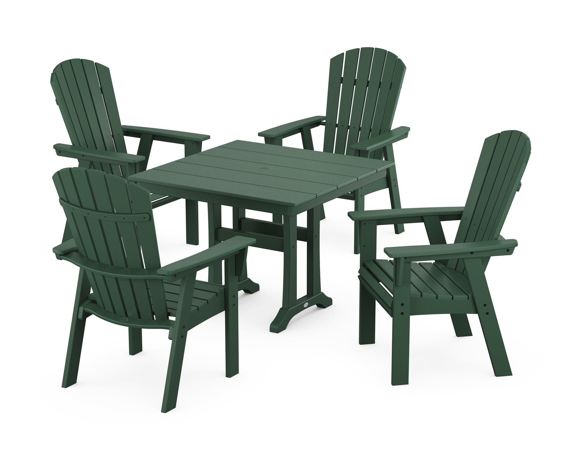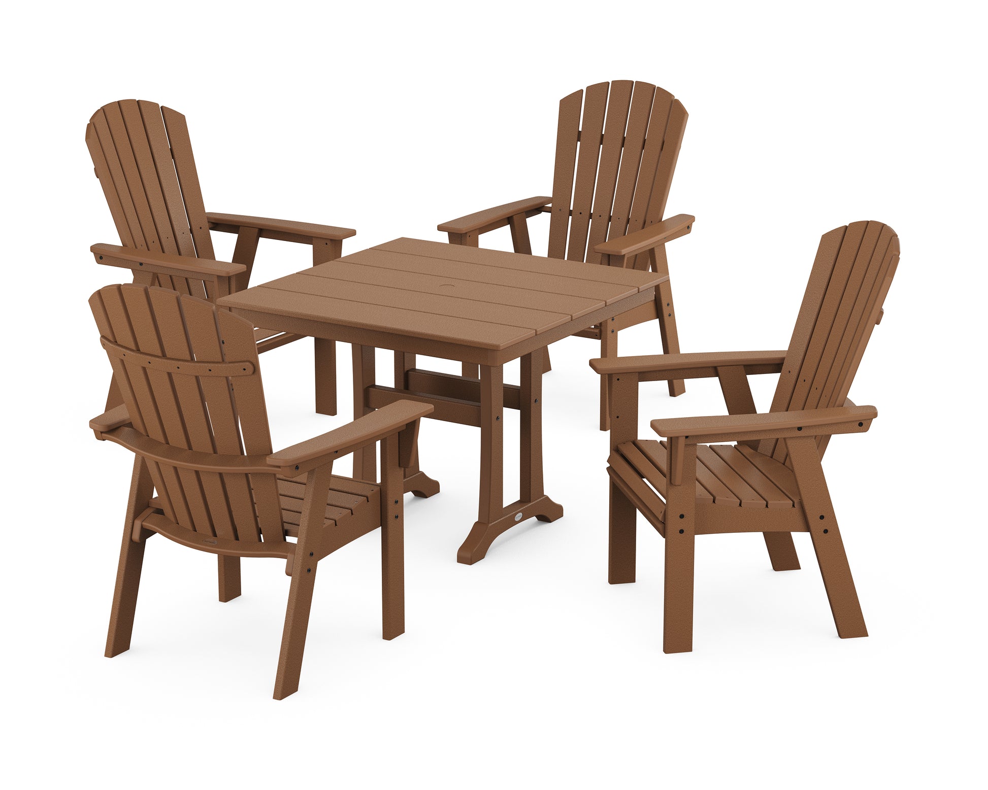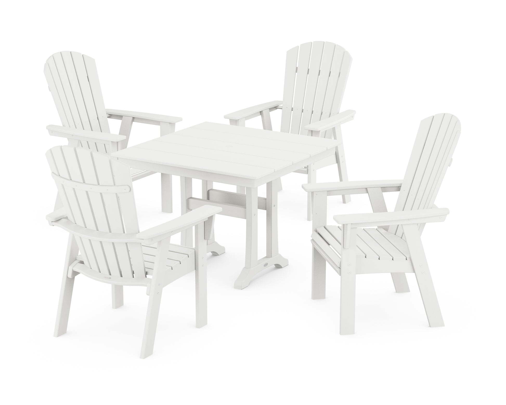Get away in your own backyard with the Nautical Collection. Offering a marina-inspired aesthetic with its signature curved headboards and reclined profiles, every piece is designed to stand out on any deck. Bring the shore to your outdoors with the all-weather Nautical Adirondack 5-Piece Farmhouse Dining Set With Trestle Legs ? four comfortable armchairs surrounding a square dining table.