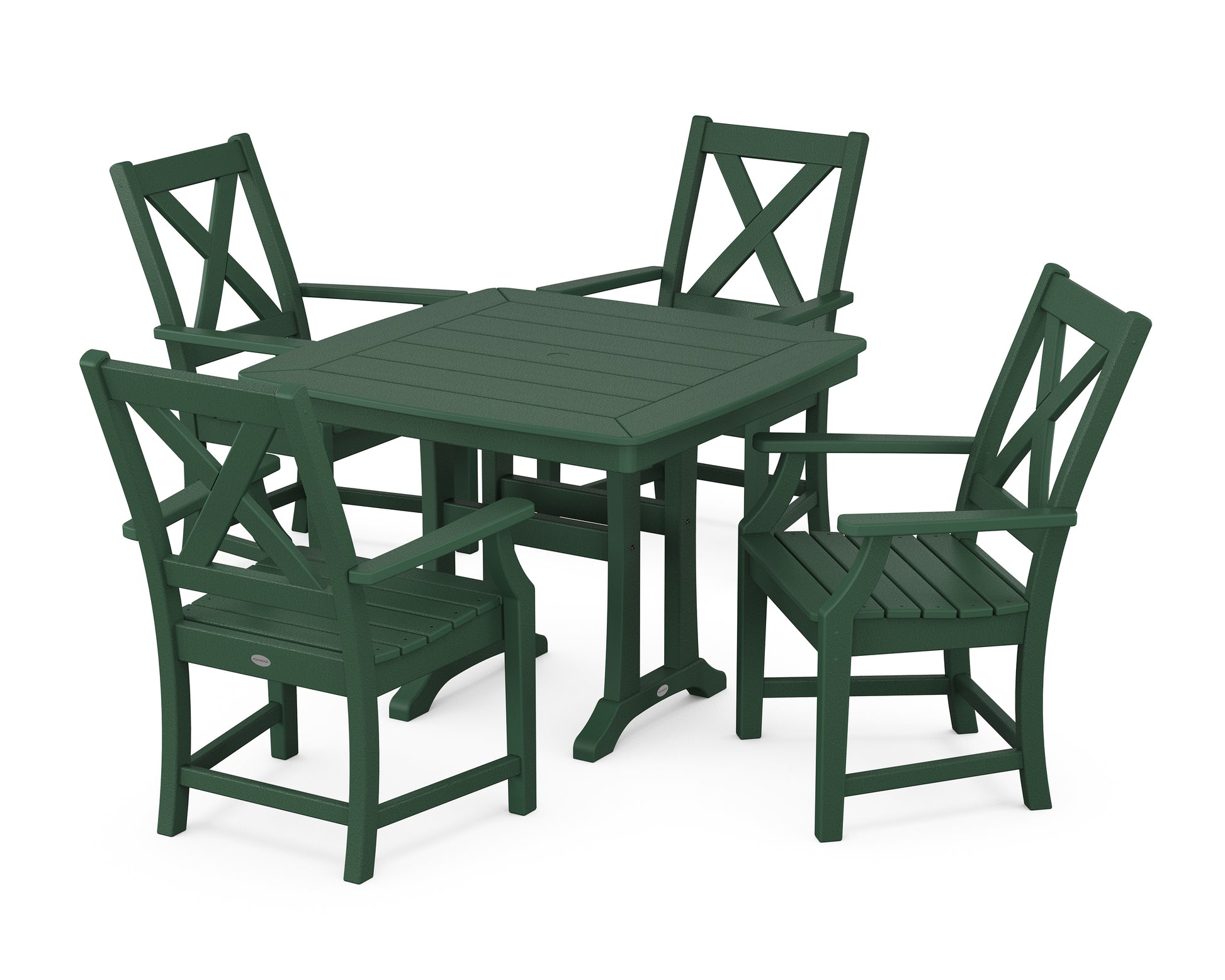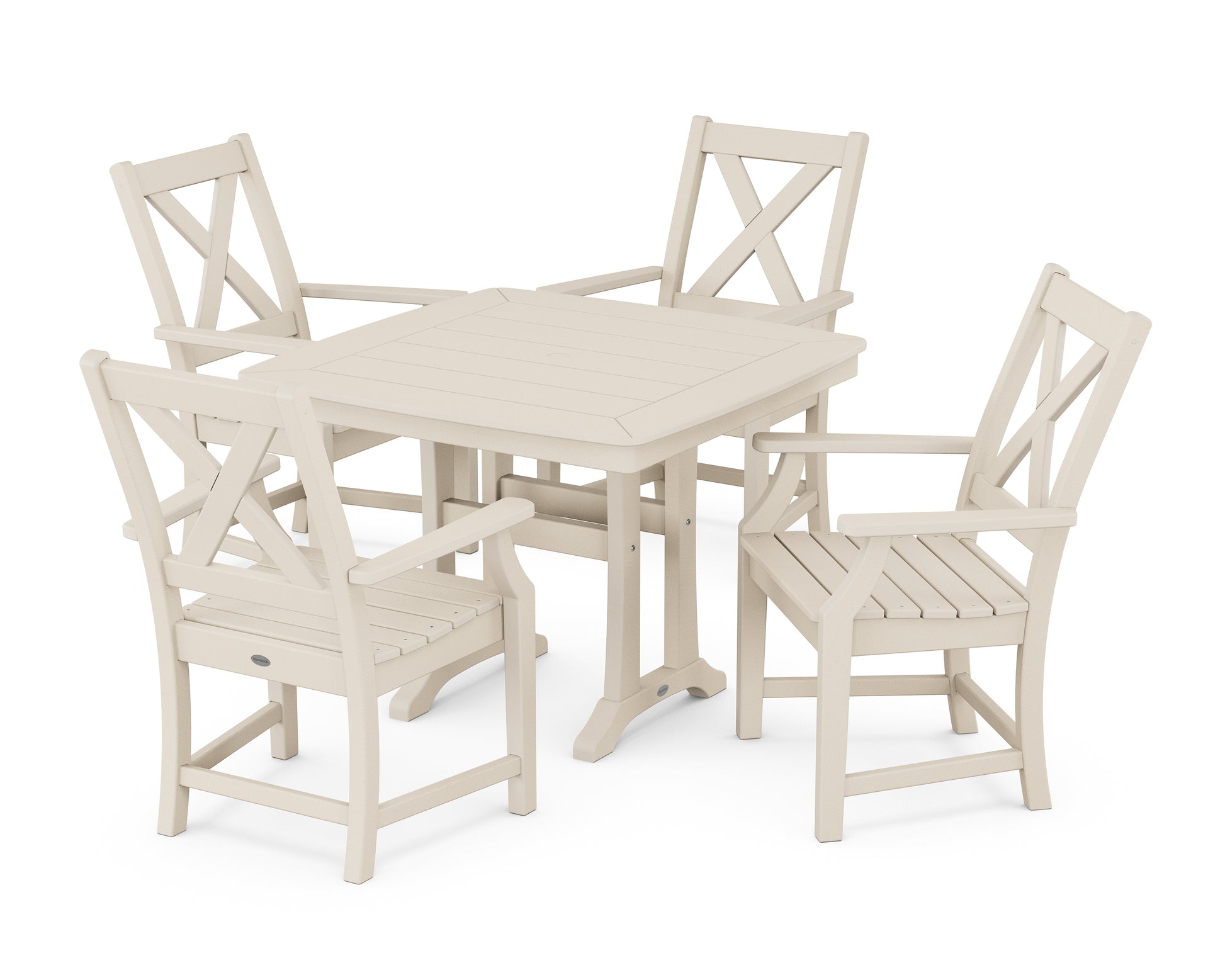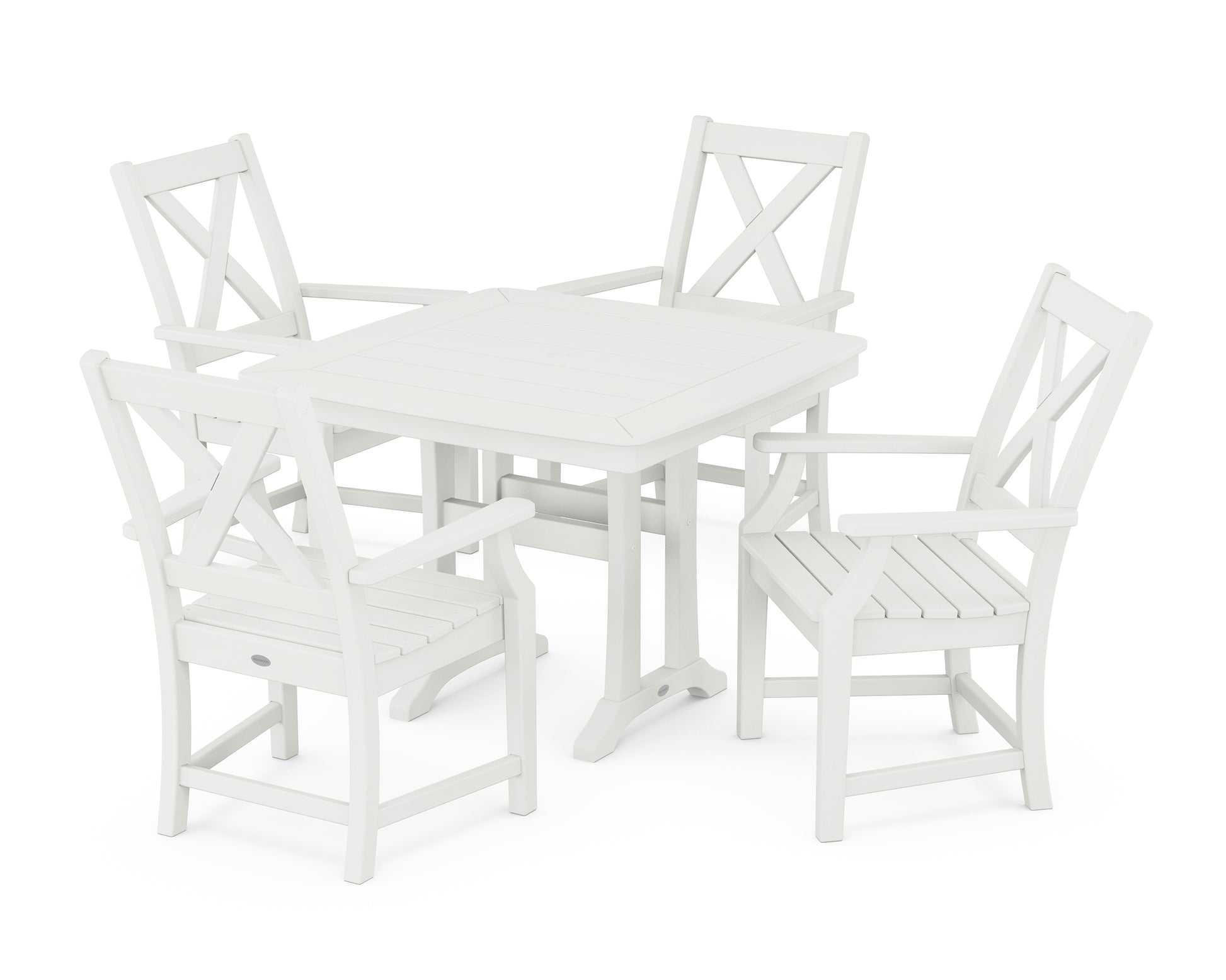 A blend of modern design and rustic elements, the Braxton Collection is always a conversation starter. Forever in season and forever in style, this all-weather collection finds its balance with clean lines, curved profiles, and farmhouse-inspired x-back design. Set an inviting dinner scene for family and friends with our Braxton 5-Piece Dining Set with Trestle Legs, shown here with four armchairs sitting pretty around a square dining table.