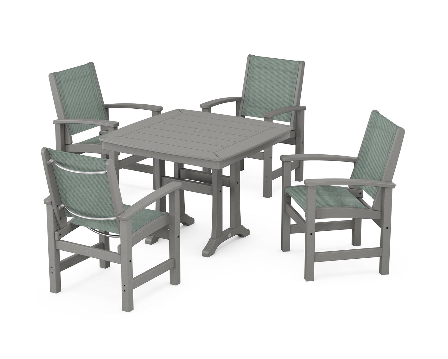 Two words sum up the Coastal Collection: comfortable and carefree. Designed with materials that withstand all the elements, the Coastal 5-Piece Dining Set features durable lumber frames and all-weather sling seats for a resort-inspired look and feel. Centered around a stylish table, this set easily and comfortably accommodates a family of four.
