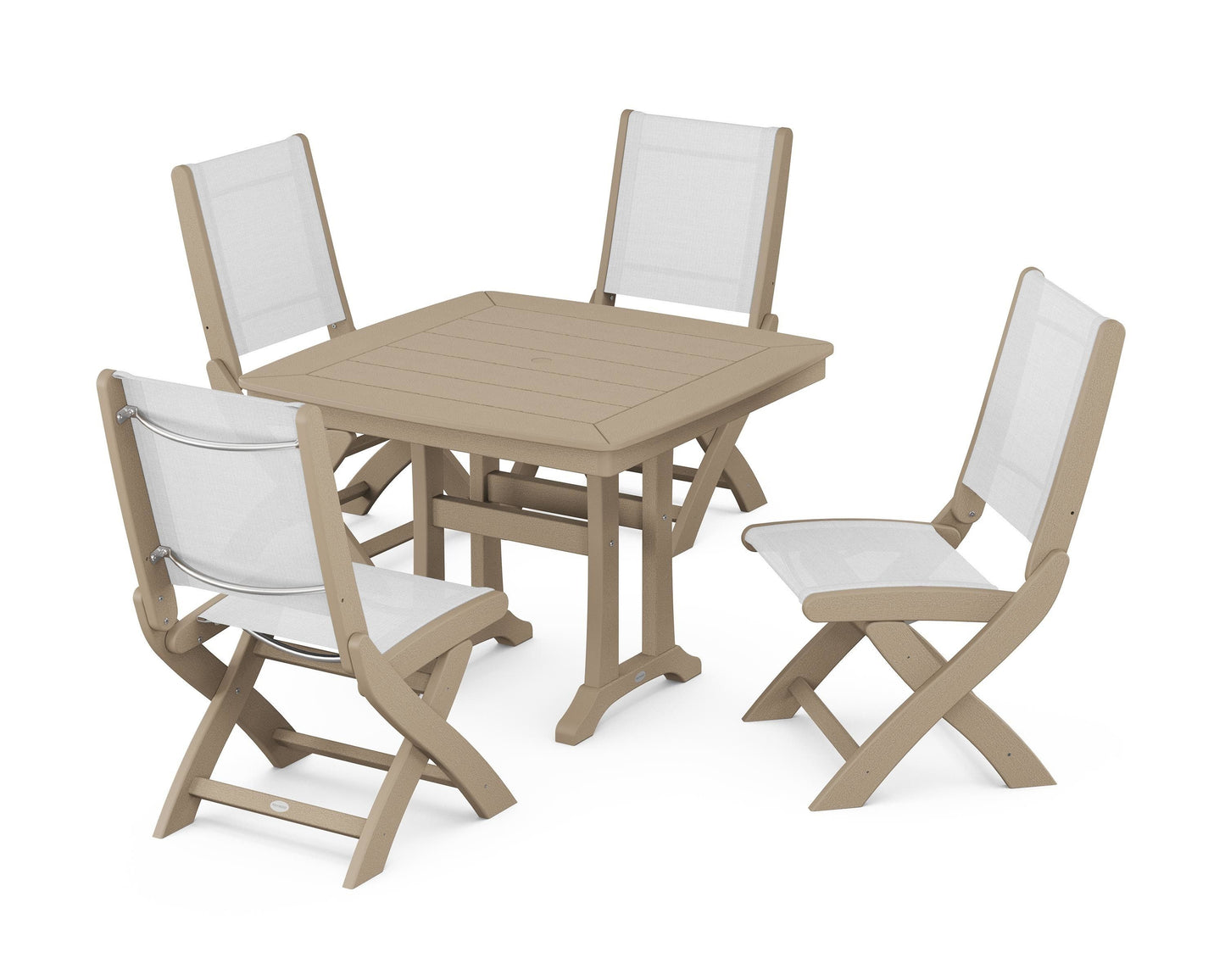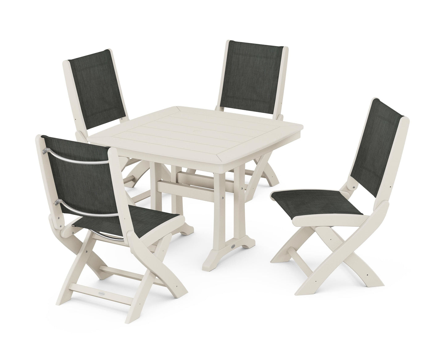 Two words sum up the Coastal Collection: comfortable and carefree. Designed with materials that withstand all the elements, the Coastal Folding Side Chair 5-Piece Dining Set with Trestle Legs features durable lumber frames and all-weather sling seats for a resort-inspired look and feel. Centered around a stylish table, this set easily and comfortably accommodates a family of four. Whenever you need extra space, simply fold the side chairs down and tuck them away.