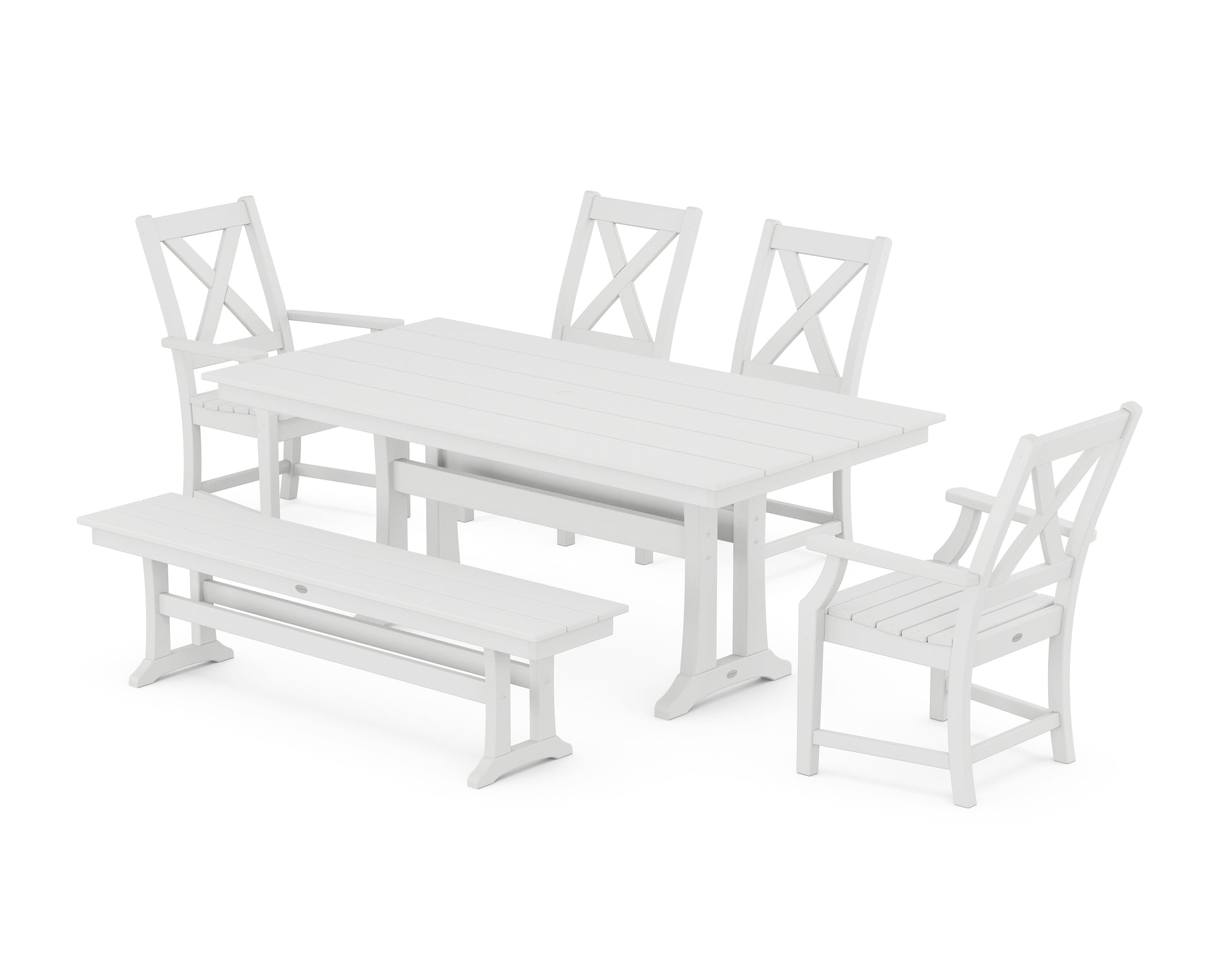 A blend of modern design and rustic elements, the Braxton Collection is always a conversation starter. Forever in season and forever in style, this all-weather collection finds its balance with clean lines, curved profiles, and farmhouse-inspired x-back design. Set an inviting dinner scene for family and friends with our Braxton 6-Piece Farmhouse Dining Set With Trestle Legs, shown here with two side chairs, two armchairs, and a bench sitting pretty around a rectangle dining table.
