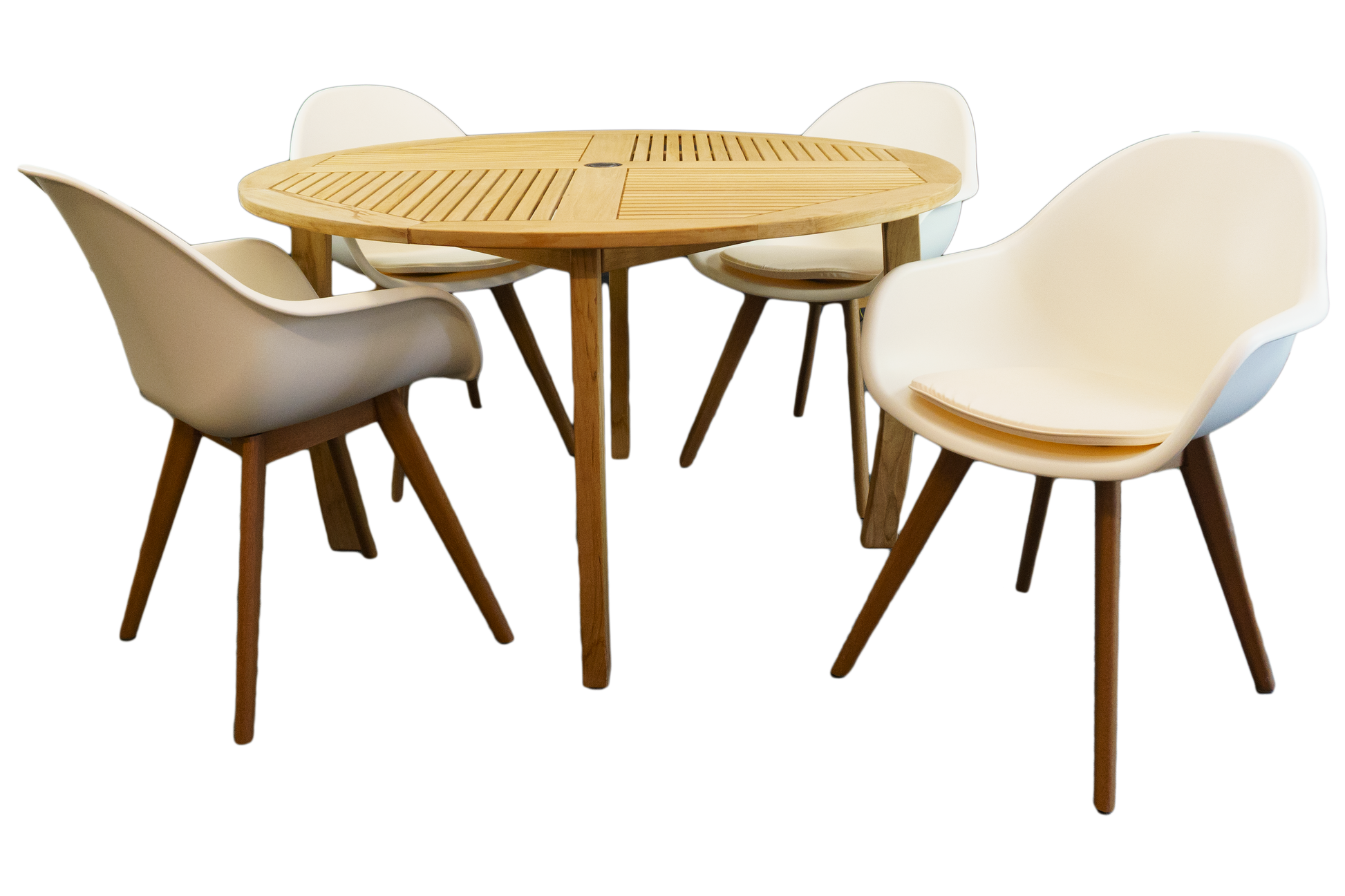 The Teak 5-Piece Dining Set combines the strength and low maintenance of poly materials with the natural beauty of teak wood. Designed with a convenient umbrella hole, it allows for easy integration of shade options to enhance outdoor dining experiences. This set offers durability and elegance, making it a practical and stylish addition to any patio.